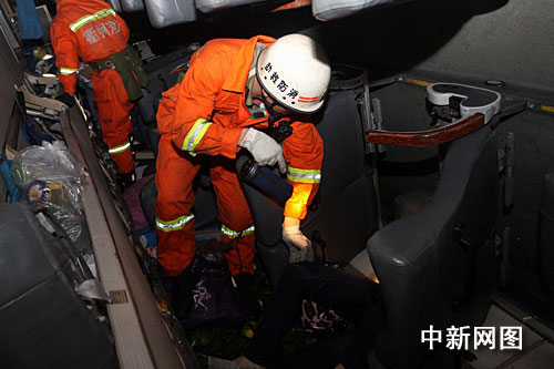 經(jīng)過半個(gè)多小時(shí)的緊張施救,側(cè)翻的大客車被吊起。客車車身輕微變形,擋風(fēng)玻璃粉碎,車窗不同程度破碎。被壓車底的兩名乘客經(jīng)現(xiàn)場醫(yī)生檢查,無生命跡象,當(dāng)場死亡。