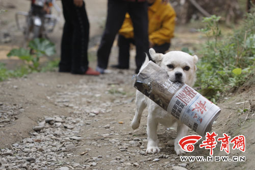 每天上午9時,給李爺爺家送華商報的投遞員張躍進,會準時到達位于西安市南郊的東三爻堡!皥蠹垇磉!”站在李爺爺家門前一段50多米長的坡路下,張躍進會扯著嗓子吆喝一句。幾秒鐘后,張躍進和周圍的鄰居便會看到,一條黃白相間的小狗,從坡路上飛快地跑來,用嘴叼起張躍進遞來的報紙!翱烊!把報紙給爺爺!甭犃藦堒S進的話,小狗花花扭身徑直跑到李爺爺跟前,把報紙交到老人手中。