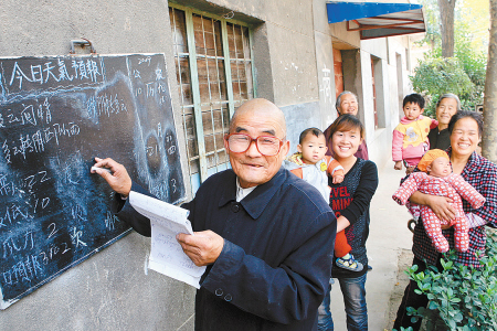 從2001年3月14日開始,他做了一塊小黑板掛在自家小商店前,把當天的天氣預(yù)報寫在上面。夏秋農(nóng)忙時,早上7點半,下午5點,他一天要出兩期天氣預(yù)報,兩次“更新”內(nèi)容,讓村民們在第一時間看到最新的天氣預(yù)報。除此之外,老人還會在黑板上寫上根據(jù)天氣變化增減衣服等溫馨提示。村民們出門前常常在這塊小黑板前停下腳步,誰要走親戚,看到黑板上預(yù)報當天有雨,就趕緊回家拿上雨具,再加件衣服……這塊小黑板成了村民的好幫手!安还芄物L下雨,還是逢年過節(jié),這黑板上的天氣預(yù)報肯定是最新的內(nèi)容!”村民王師傅說。