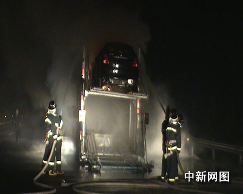 中新網(wǎng)淮安10月23日電 (郭志明 衡中強(qiáng) 朱曉穎) 23日凌晨3時許,江蘇淮安市洪澤消防中隊接到市支消防指揮中心指令稱,寧連高速向鹽城方向162公里處一拖車自燃,拖車所載的吉利自由觀新車亦被燒毀。消防聞訊后迅速處置。