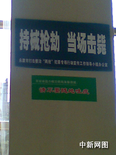 中新網(wǎng)永康11月5日電(記者 陳國(guó)亮 古其錚)中新網(wǎng)記者今天在浙江永康采訪時(shí)發(fā)現(xiàn),幾天前在該市街頭還能見(jiàn)到的一些“持械搶劫 ,當(dāng)場(chǎng)擊斃”標(biāo)語(yǔ)如今已經(jīng)不見(jiàn)。而永康市政法委及永康市公安局相關(guān)負(fù)責(zé)人11月4日在面見(jiàn)中新網(wǎng)記者時(shí)也通過(guò)口頭和書(shū)面等方式表示,他們以前張貼的標(biāo)語(yǔ)中確實(shí)有幾種標(biāo)語(yǔ)在用語(yǔ)上存在不夠嚴(yán)謹(jǐn)?shù)膯?wèn)題。