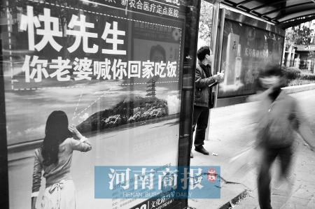 鄭州的農(nóng)業(yè)路、文化路、二七路等繁華路段、公交站臺新近出現(xiàn)了許多廣告牌,什么“肛腸泌尿”、“豐胸整形”、“無痛流產(chǎn)”……種類繁多,最引人注目的是一個畫面上一位妙齡女士在大喊“快先生,你老婆喊你回家吃飯”的廣告。