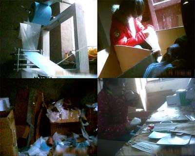 記者看到這里正在進(jìn)行包裝,在這個所謂的廠家里生產(chǎn)衛(wèi)生用品的工人們,沒有一個人穿著工作服,戴工作帽,包裝封口的機(jī)器,也是幾根木條定在一起,就湊合著用了,最出乎記者意料的,還不是這些簡陋的生產(chǎn)環(huán)境,而是包裝口罩的工人極不規(guī)范的動作,看到這個阿姨一邊蘸著唾沫一邊包裝口罩的手法,讓記者不禁為那些可能會戴上這包口罩的人感到擔(dān)心。