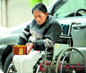在廣州市人民中路的高架橋下,人們經(jīng)常會(huì)看見(jiàn)一個(gè)扶著輪椅佝僂獨(dú)行的女人。每天清晨,她從這里出發(fā),輾轉(zhuǎn)于各個(gè)寺廟、教堂乞討,每天深夜,她又回到這里,蜷縮在一個(gè)網(wǎng)吧的門(mén)前露宿。