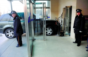 昨日下午4時(shí)許,京版信息港寫字樓前,一輛路虎越野車騎在大樓入口處,車身只有擦痕,四周散落著鋁合金框架和玻璃碎片,寫字樓大門已經(jīng)被撞碎了一半。