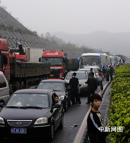 記者當日16時30分經(jīng)京珠高速從廣州到韶關,行至清遠湯塘附近時發(fā)現(xiàn)交通已經(jīng)堵塞,前方北行高速路上堵滿了大大小小的車輛,一眼望不到頭,被堵的車龍長達5公里。此時,雨一直下著,天氣很冷。一些已經(jīng)被堵了近2小時的乘客一邊吃著食物,一邊焦急等待著。