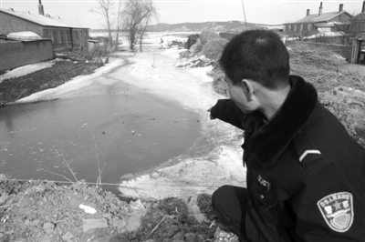 25日14時(shí)許,記者來(lái)到位于依蘭縣宏克力鎮(zhèn)東北方向的三義村,在村前路口轉(zhuǎn)彎處,記者見到一個(gè)寬約10米,長(zhǎng)約40余米的條狀大坑,這里就是三個(gè)孩子出事的地方。此時(shí)的大坑水面上仍結(jié)著冰,但部分冰面已經(jīng)破碎,水面上還冒著熱氣。大坑周圍已經(jīng)圍上了繩索,一塊木板警示牌上面寫著“此處水深危險(xiǎn)”,紅色的油漆還沒(méi)有干。附近的居民告訴記者,這塊木牌和攔坑的繩索都是今天早晨才設(shè)立的。