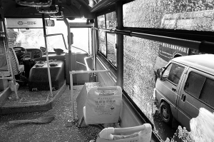 昨日17時(shí),記者趕到現(xiàn)場。為了不使被砸的這輛25路公交車影響其它公交車發(fā)車,該車已經(jīng)從站點(diǎn)移開。被砸公交車的前風(fēng)擋玻璃、前車門玻璃以及車兩側(cè)近10塊車玻璃被砸碎,車內(nèi)滿地是玻璃碎片。
