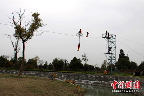 “小燕子”迅速調(diào)整姿勢、繼續(xù)前進(jìn),剛剛十步開外,最驚險的一幕出現(xiàn)了,園中的老虎似受到現(xiàn)場緊張氣氛的影響,突然顯得有些躁動不安,在鋼絲繩下來回走動,并警覺的看著上方的挑戰(zhàn)者“小燕子”,驚天動地般地呼嘯了兩聲后,成年公虎“阿彪”向著“小燕子”所在的上方跳去,差點碰到位于鋼絲下方領(lǐng)路的自行車扶梯上。同時,一只母虎試圖爬到附近的大樹上!靶⊙嘧印币欢认萑肓死匣⒂|爪可及的危險境地,實在是讓現(xiàn)場觀眾為她捏了一把冷汗。鋼絲上,命懸一線的“小燕子”,在空中搖晃了幾下,停下來凝神吸氣,盡力控制住鋼絲不再晃動,一步一步向鋼絲另一端走去。終于,“小燕子”耗時近20分鐘,成功的完成挑戰(zhàn),一舉突破50米,創(chuàng)造了自己新的紀(jì)錄,爾后空手走到自行車前“凱旋”,觀眾忍不住拍手叫絕。