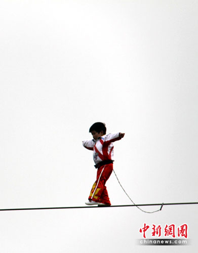 中新網(wǎng)常州3月30日電(記者 唐娟)30日,年僅3歲半的江西女童“小燕子”(藝名,原名張小燕),在江蘇常州淹城野生動物世界上演了一出老虎頭上空手走鋼絲的驚險絕技。在成功走了50米鋼絲后,“小燕子”所在的江西神童藝術(shù)團(tuán)張團(tuán)長宣布,三日后,“小燕子”將向百米發(fā)起挑戰(zhàn),刷新紀(jì)錄,并申報“虎口空手走鋼絲”吉尼斯世界紀(jì)錄;同時,“小燕子”將在常州淹城野生動物世界設(shè)下一個月的擂臺,歡迎國內(nèi)外各界人士前來挑戰(zhàn),勝者當(dāng)場懸賞100萬元。