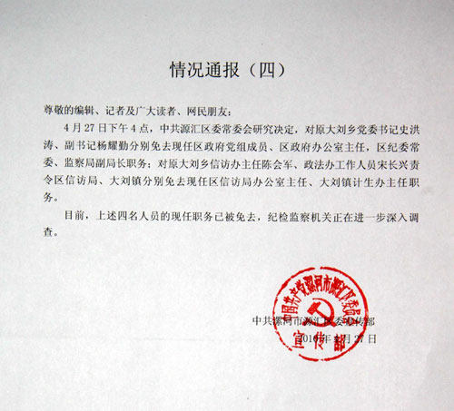 27日,漯河市源匯區(qū)委宣傳部通報說,中共源匯區(qū)委常委會研究決定,對原大劉鄉(xiāng)黨委書記史洪濤、副書記楊耀勤分別免去現(xiàn)任區(qū)政府黨組成員、區(qū)政府辦公室主任,區(qū)紀(jì)委常委、監(jiān)察局副局長職務(wù);對原大劉鄉(xiāng)信訪辦主任陳會軍、政法辦工作人員宋長興責(zé)令區(qū)信訪局、大劉鎮(zhèn)分別免去現(xiàn)任區(qū)信訪局辦公室主任、大劉鎮(zhèn)計生辦主任職務(wù)。目前,上述四名人員的現(xiàn)任職務(wù)已被免去。