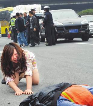 卡宴車頭前10余米的右側(cè)車道上,幾個(gè)男女跪在地上,圍成一圈放聲痛哭。
