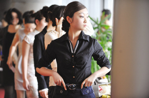 候場(chǎng)區(qū),美女云集的地方,只要一個(gè)轉(zhuǎn)身,你就可以看見(jiàn)近千名佳麗有的在偷偷補(bǔ)妝,有的對(duì)著鏡子練習(xí)微笑。在等候面試的美女中,有帶著綠色美瞳的美國(guó)加州留學(xué)生,有穿背帶褲剛剛高中畢業(yè)的學(xué)生,還有身著職業(yè)裝想換個(gè)工作的公司白領(lǐng)。“現(xiàn)在工作不好找,所以只要有招聘就來(lái)試試咯!边@是記者在現(xiàn)場(chǎng)聽(tīng)到最多的一句話。