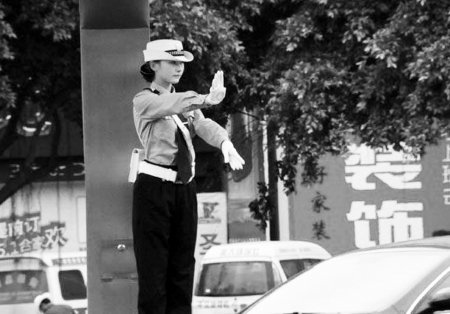 照片內(nèi)容大同小異:在一個(gè)路口崗?fù)ぃ幻叭蔽溲b”的女交警,變換著手勢(shì),指揮過(guò)往車輛和行人通行。