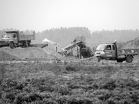 耕地已被毀,機(jī)械穿梭忙,振動(dòng)篩正在向車(chē)上裝沙