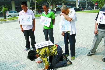 昨日上午9時許,鄭州市紫荊山立交橋附近,河南飯店南門口小廣場上,5名農民工頭頂烈日手持訴狀,身上前后掛著兩個大牌子,背面寫著“幫俺討薪,懸賞萬元”,正面是形象生動的漫畫,農民工此舉引來不少市民圍觀。