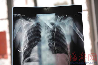 前晚,在第一醫(yī)院急救室,經(jīng)過4個(gè)多小時(shí)的搶救,醫(yī)生將匕首從小勇身上取出,發(fā)現(xiàn)這把匕首的刀尖扎斷了1厘米。由于小勇肺部被刺中,昨天上午,醫(yī)生再次進(jìn)行了3個(gè)多小時(shí)的手術(shù),切除了受傷的部分肺,直到下午,小勇才挺過來!巴α艘灰梗F(xiàn)在總算醒了過來!睏钆恳灰箾]睡,守在手術(shù)室外7個(gè)多小時(shí),生怕兒子再醒不過來。不過,由于傷勢(shì)嚴(yán)重,小勇目前戴著氧氣呼吸,仍未脫險(xiǎn)。
