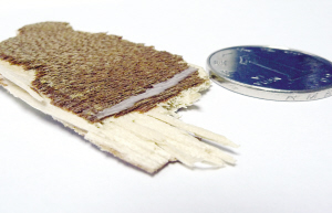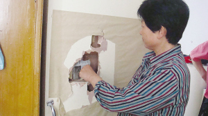 記者看到304室北面小屋的門,有一部分用牛皮紙貼上,輕輕撕開(kāi)紙,赫然出現(xiàn)一個(gè)大洞。她說(shuō)這是有天早晨喊女兒起床時(shí)敲通的。一個(gè)年過(guò)半百的女子,竟然敲門時(shí)就輕易地把門敲通,可見(jiàn)這門板的質(zhì)量。果然,記者很輕易就掰下一塊面板,這種復(fù)合木板的厚度不到3毫米,難怪經(jīng)不起“敲”。