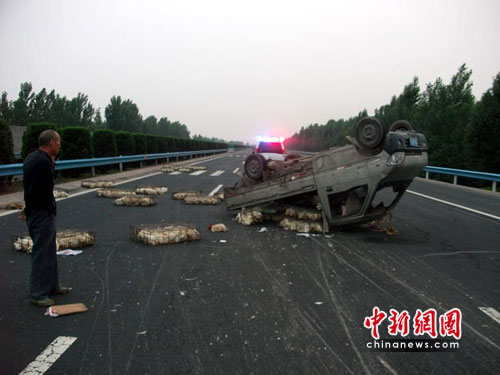 2010年6月22日中午13時許,炙熱的太陽照得大地只想冒煙,一輛白色小貨車滿載雞子疾馳在京港澳高速公路上。當行駛到京港澳高速632公里西半幅時,突然“咚”一聲響,坐在駕駛位上的李某突然感覺車輛傾倒,控制不住疾馳的貨車,車輛側(cè)翻在高速公路上,滿車的雞子撒在路上,到處都是雞毛。河南高速交警總隊黃河二橋大隊接到過路司機的報警后,迅速趕到事故現(xiàn)場,設置警戒帶,迅速搶救傷員,所幸駕駛員李某事先行車時扎緊了安全帶,只是受了皮外傷,在急救人員救出時依然茫然不知所措。在民警、路政工作人員的共同努力下,迅速清理現(xiàn)場,恢復路面正常通行。