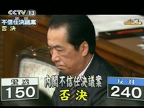 內(nèi)閣不信任案遭否決 菅直人繼續(xù)擔(dān)任日首相