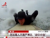 沖浪愛(ài)好者不畏嚴(yán)寒在冰湖中玩沖浪