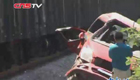 【解說】記者在事發(fā)現(xiàn)場(chǎng)看到,此處山崖約20多米,坡上和崖底滿是堅(jiān)硬的石塊,事故路段沒有護(hù)欄。出事的正三輪摩托車已經(jīng)完全扭曲變形,山坡下鮮紅的血跡觸目驚心。