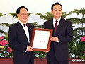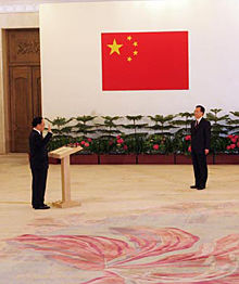 6月24日上午9時,香港特區(qū)行政長官曾蔭權就職儀式在人民大會堂香港廳舉行。曾蔭權向溫家寶總理宣誓就職。溫家寶總理向曾蔭權頒發(fā)了中央人民政府任命書