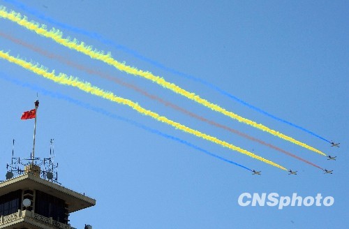 國慶閱兵:領(lǐng)隊機梯隊飛過北京上空