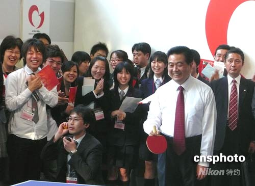 圖:胡錦濤在早稻田大學(xué)打乒乓 與日本青年交流