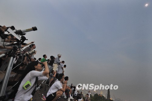 中國各地群眾觀看日食奇觀:杭州寶石山上看日食