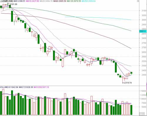 近期弱反彈行情回補了前期跳空缺口,由于缺少成交量的有效配合,因此短期反彈幅度較為有限,2450點附近構成一定壓力,預計要出現(xiàn)再次震蕩反復,二次回探驗證前期低點的有效性。目前技術組合還沒有出現(xiàn)反轉跡象,也不能確定2319點為最低點,仍需要等待農(nóng)行上市之后的表現(xiàn),但轉機已在逐步臨近。