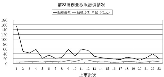 從融資規(guī)?矗23批已上市的120只創(chuàng)業(yè)板股首發(fā)合計融資854.62億元,平均每股首發(fā)募資7.12億元。其中,首批28股合計融資154.78億元,居各批次之首;4月30日上市的第11批4股合計融資59.30億元緊隨其后;第9批、第4批及第12批創(chuàng)業(yè)板股首發(fā)融資額皆在50億元以上;而8月25日上市的第20批3股僅合計融資12.86億元,規(guī)模最小。