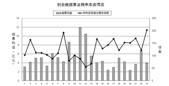 若按創(chuàng)業(yè)板上市公司計(jì)劃的募集資金,則板塊的初始規(guī)模也將小得多。統(tǒng)計(jì)顯示,前23批創(chuàng)業(yè)板股首發(fā)預(yù)計(jì)募資總額為276.82億元,而首發(fā)募資總額卻比其超出577.80億元,超募比例高達(dá)2.09倍,平均每家公司超募4.82億元。事實(shí)上,板塊超募比例在1倍以上的個(gè)股多達(dá)103只,占總數(shù)的86%,可見對(duì)創(chuàng)業(yè)板而言,超募就是一種常態(tài)。