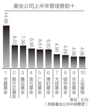 華夏、易方達(dá)、嘉實、南方、博時、廣發(fā)、大成、華安、銀華、上投摩根的管理費(fèi)收入位于前10,合計高達(dá)70.51億元,已接近全行業(yè)的一半。華夏以14.6億元的管理費(fèi)收入遙遙領(lǐng)先,易方達(dá)、嘉實、南方、博時的管理費(fèi)收入分別為8.03億元、7.99億元、7.35億元、6.76億元。