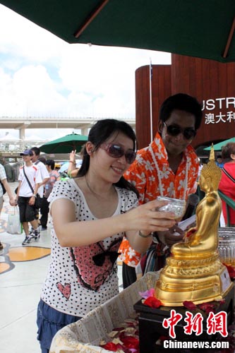 8月6日,世博會(huì)泰國(guó)館上演“宋干節(jié)”,館方特地在館門(mén)外放置了一尊金燦燦的佛像,供參觀者拜佛祈福。參觀者虔誠(chéng)地以雙手捧持著銀杯,將一種古老的泰式香水自佛像頭頂澆下,祈求一年好運(yùn)。這也是佛國(guó)泰國(guó)過(guò)“宋干節(jié)”的特有習(xí)俗。