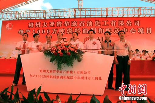 總投資53.9億元人民幣,設(shè)計(jì)年生產(chǎn)能力達(dá)1000萬噸的廣東惠州大亞灣華瀛石油化工有限公司燃料油調(diào)和配送中心項(xiàng)目9日正式動(dòng)工建設(shè)。該項(xiàng)目是廣東省重點(diǎn)項(xiàng)目,建成投產(chǎn)后或?qū)⒊蔀橹袊?guó)最大燃料油調(diào)和配送中心。 圖為惠州市委書記黃業(yè)斌宣布惠州大亞灣華瀛石油化工有限公司燃料油調(diào)和配送中心項(xiàng)目開工。康孝娟 攝
