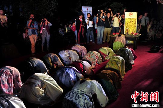 中秋之夜,大雅堂前,多名身著唐裝的美女,“經(jīng)坐”(即雅坐)于席上,行祭拜禮,主祭者“三上香”后,念誦祭月祝文。拜月禮成后,祭拜人員和全體觀眾分食月餅、供果等祭品,宴飲賞月!捌吩率骋再p花,飛羽觴而醉月!