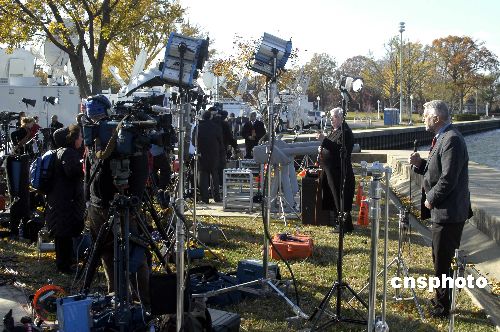 各方關(guān)注的中東和會(huì)當(dāng)?shù)貢r(shí)間十一月二十七日十一時(shí)在美國馬里蘭州安那波利斯的美國海軍學(xué)院開幕。在美國總統(tǒng)布什的主持下,巴勒斯坦民族權(quán)力機(jī)構(gòu)主席阿巴斯和以色列總理奧爾默特的雙手緊緊握在一起,現(xiàn)場響起了熱烈的掌聲。中新社發(fā) 邱江波 攝