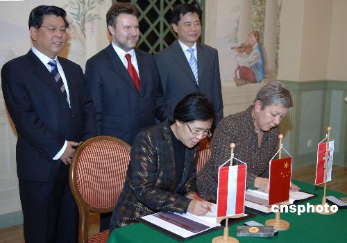 11月30日,維也納中國文化中心項目的簽字儀式在維也納市政廳舉行。中國文聯(lián)書記胡振民(后排左一)、中國駐奧地利大使吳懇(后排右一)出席簽字儀式。圖為奧中文化交流促進會會長金鈴和維也納市政府代表(前右)在合作協(xié)議書上簽字。中新社發(fā) 鐘誠 攝