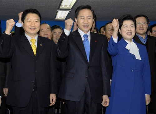 12月19日,韓國第17任總統(tǒng)選舉的計票結果顯示,大國家黨候選人李明博被確定為總統(tǒng)當選人。韓國青瓦臺總統(tǒng)府發(fā)言人千皓宣發(fā)表評論稱,祝賀李明博當選新任總統(tǒng),同時對落選的候選人表示慰問。政府尊重通過選舉反映的國民意愿。圖為韓國第17屆總統(tǒng)當選人李明博和夫人正在慶賀當選。