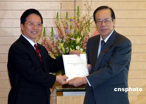 圖為華人教授會(huì)代表朱建榮向福田康夫首相遞交建議書。