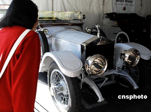 美國一百年前領(lǐng)導(dǎo)玫瑰花車大游行的勞斯萊斯老爺車,最近在洛杉磯展示,它將在二00八年元旦第119屆帕沙迪納玫瑰花車大游行中再次登場(chǎng),為北京奧運(yùn)巨型花車開路。中新社發(fā) 賈國榮 攝