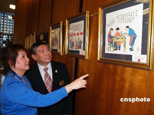 2008年1月9日,華人聚集的洛杉磯阿罕伯拉市舉行中國年畫拍賣會(huì),為阿罕伯拉市高中籌集教育基金。成都女畫家陳雪梅的12幅鼠年年畫,為美國中學(xué)生籌得近5000美金。阿罕伯拉市華裔市長沈時(shí)康、拍賣活動(dòng)負(fù)責(zé)人陳惠萍欣賞中國年畫。中新社發(fā) 盧威 攝