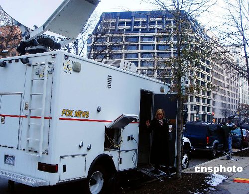 聞風(fēng)而至的美國(guó)各主流媒體將轉(zhuǎn)播車(chē)直接開(kāi)到大樓附近街區(qū),時(shí)刻準(zhǔn)備直播和報(bào)道這一突發(fā)事件,圖為Foxnews新聞停在世行總部大樓的直播車(chē)。