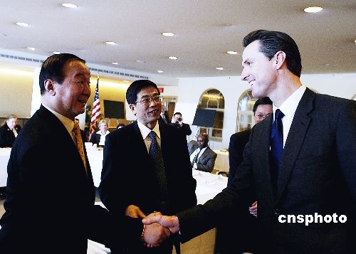 當(dāng)?shù)貢r(shí)間二月四日,北京奧組委執(zhí)行副主席蔣效愚和舊金山市長紐森共同簽署了《第二十九屆奧林匹克運(yùn)動(dòng)會(huì)組織委員會(huì)與美國奧委會(huì)奧運(yùn)火炬接力服務(wù)協(xié)議》和《第二十九屆奧林匹克運(yùn)動(dòng)會(huì)組織委員會(huì)與舊金山市奧運(yùn)火炬接力服務(wù)協(xié)議》。圖為蔣效愚(左)高占生(中)和紐森在簽字儀式現(xiàn)場。中新社發(fā) 陳鋼 攝