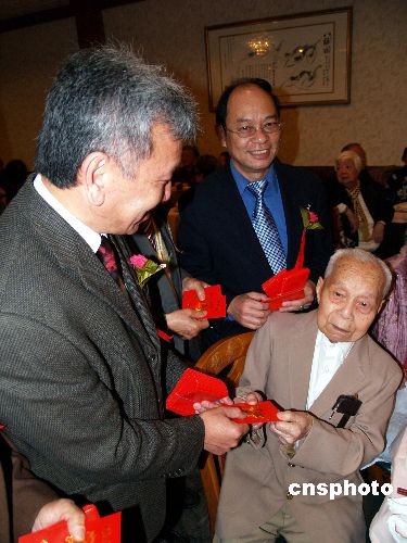圖為中華會(huì)館主席伍競(jìng)?cè)旱葍S領(lǐng)特向101歲的老人周榮福發(fā)紅包。