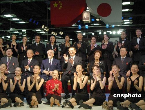 圖為唐家璇與該團(tuán)創(chuàng)始人清水正夫、松山樹子及該團(tuán)全體團(tuán)員合影留念。