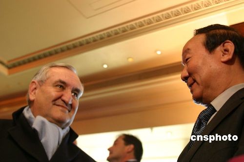 當(dāng)?shù)貢r間4月7日中午,北京奧運圣火在“浪漫之都”巴黎傳遞在巴黎的地標(biāo)埃菲爾鐵塔拉開帷幕。圖為北京奧組委執(zhí)行副主席蔣效愚(右)與法國前總理拉法蘭在起跑儀式前交流溝通。 沈晨 攝