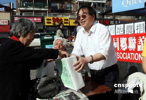 5月13日下午,在紐約第二大華埠——法拉盛,紐約華人社團聯(lián)席會及屬下四川同鄉(xiāng)聯(lián)誼會在街頭募集捐款,援助四川地震災(zāi)區(qū),很多過往行人紛紛捐款。中新社發(fā) 譚宏偉 攝