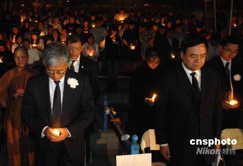 南加州悼念中國汶川地震遇難同胞燭光追思會當(dāng)?shù)貢r間五月二十一日晚在美國加州蒙特利公園市舉行。各界人士手捧蠟燭在夜色中默默祈禱,悼念中國汶川地震遇難同胞,愿逝者早日安息,生者更加堅強。圖為中國駐洛杉磯總領(lǐng)事張云(前左)、南加州華人聯(lián)合總會會長程遠(yuǎn)(前右)和大家一起為遇難同胞默哀。中新社發(fā) 張煒 攝